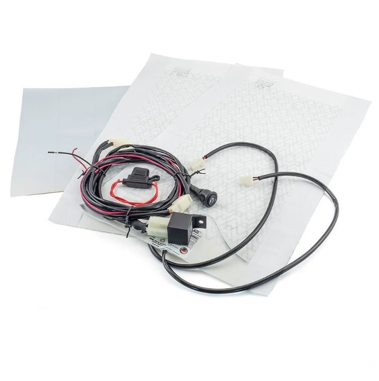 Zuverlässig hochbelastbare Carbon Sitzheizung Typ HEAT201 für einen Fahrzeugsitz mit 2-stufiger Temperatureinstellung mit einem rastenden Schalter. Geeignet für die Installation unter der Lederpolsterung der Rückenlehne und dem Sitzpolster.