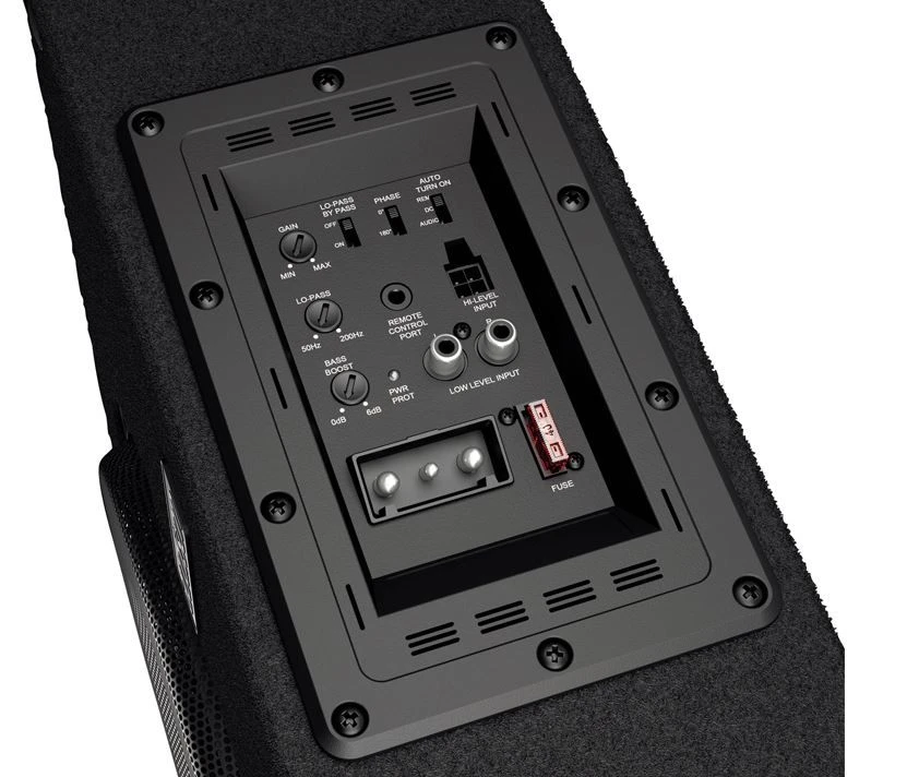 Der High-Level-Eingang für die Lautsprecher an einem mehrpoligen Stecker vereinfacht die Integration mit OEM-Audiosystemen, während der Low-Level-Eingang für RCA für die Verbindung mit After-Market-Quellen gedacht ist. Die automatische Ein- / Ausschaltfunktion des Subwoofers ART (Automatic Remote Turn-On) kann so konfiguriert werden, dass sie über das Fernbedienungssignal der Quelle, die Spannungsänderung am High-Level-Eingang oder das Audiosignal an beiden Eingängen gesteuert wird. Die Phasensteuerung (0 – 180 °) vervollständigt das Gerät.