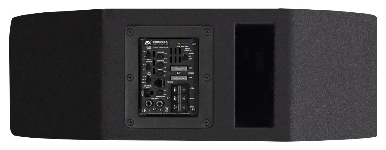Wer keinen Platz aufgeben will und über eine Ersatzradmulde verfügt, kann sich mit dem DBX800A Aktiv-System mit 2 x 20 cm Dual-Bestückung richtig erwachsenen Bass ins Auto holen. Der Bass geht tief und kräftig und überzeugt sogar „Hardcore-Bassfans“, denen es nie genug Bass im Auto sein kann. Als Verstärker fungiert in diesem Modell das preisgekrönte POWER4 Aktiv-Modul, welches in Sachen Features und Leistung einem erwachsenen Monoblock in nichts nachsteht.