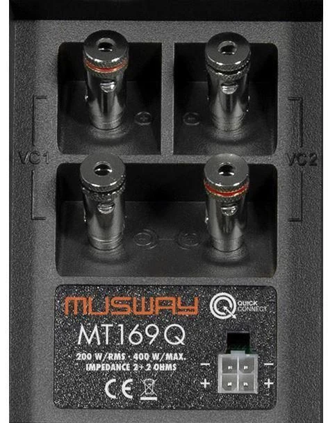 Die stabil konstruierten MDF-Gehäuse sind mit hochwertigem schwarzem Teppich bezogen und fügen sich harmonisch und dezent in jedes Fahrzeuginterieur ein. Weiterhin sind ohne Ausnahme alle Modelle mit Quick Connect Anschlussbuchsen ausgestattet und können blitzschnell per optionalem Anschlusskabel beispielsweise an die Musway M6 und deren QUICK CONNECT Port angeschlossen werden. Selbstverständlich können die MUSWAY Subwoofer-Systeme auch konventionell an herkömmliche Push-Pin Terminals angeschlossen werden.